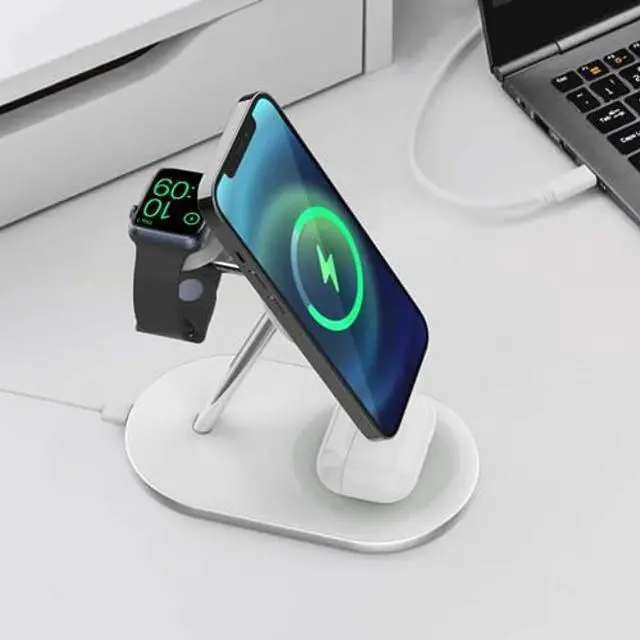 The 3 in 1 Wireless Stand is the essential magnetic charging solution. The space-saving design neatly stacks your phone, watch, and pods. Charge your phone in landscape or portrait or anywhere in-between.
