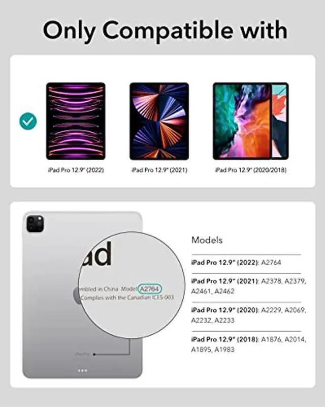Compatibility: only compatible with iPad Pro 12.9 inch (2022/2021/2020/2018); models: A2764, A2437, A2436, A2378, A2379, A2461, A2462, A2229, A2069, A2232, A2233, A1876, A2014, A1895, A1983
