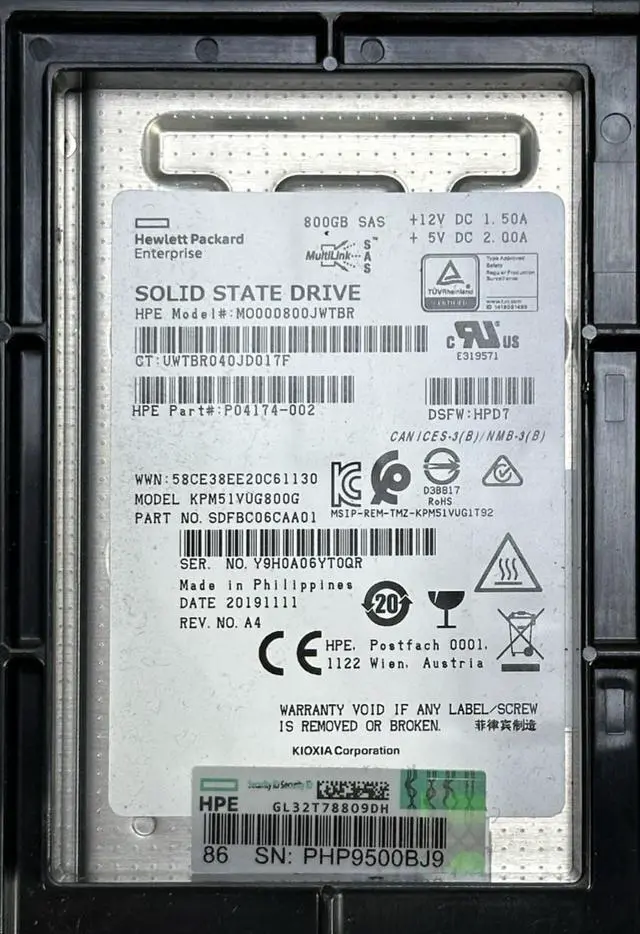 (NOT FOR HOME PC!) HPE 800GB SAS 12G DS MU SSD Mixed Use 98-99% Kioxia PM5-V LP P04174-002 SC Tray