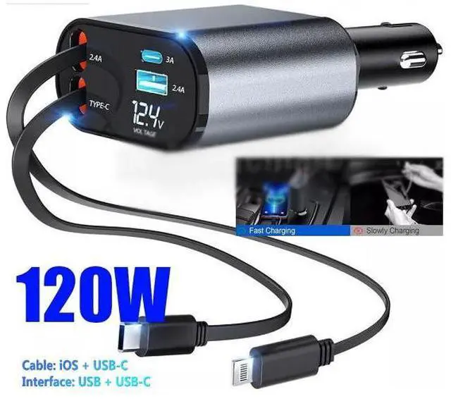 1 x Retractable Car Charger 4 in 1 Fast Car Phone Charger 120W With USB Type C Cable