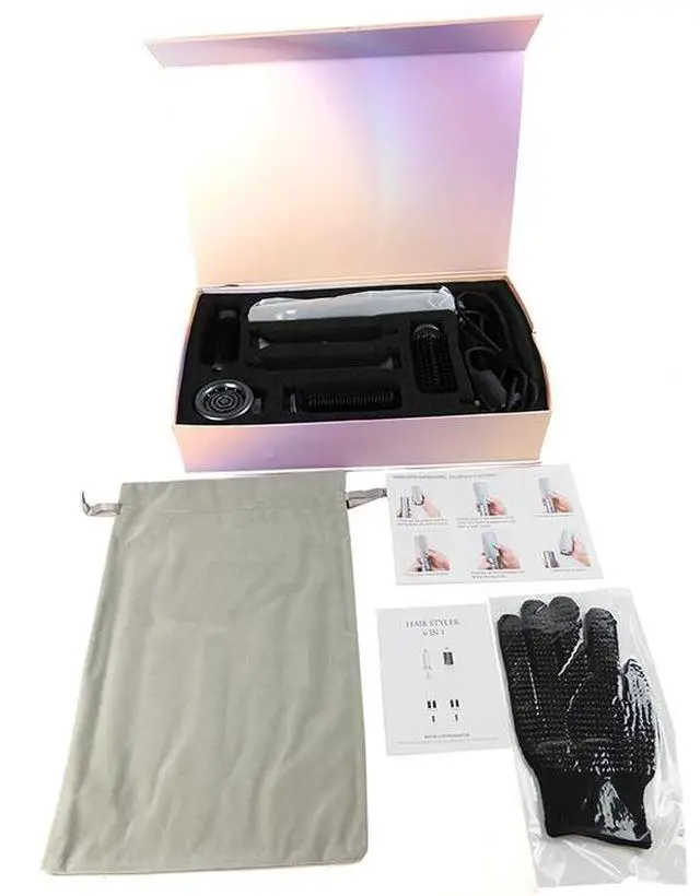 Features: Sleeking brush, Smoothing brush, Volumzing brush, Left curler and Right curler, Drying nozzle, Protective glove, Carying pouch, User manual
