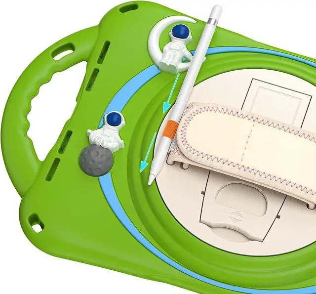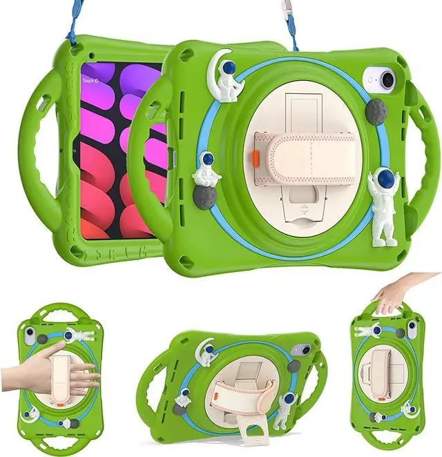 FEATURES: Built-in Kickstand is 360 degree rotating, you can adjust your iPad Mini 6 to whatever angle you want, perfect for watching videos and chatting; Convenient Handle Grip enable to hold on and carry your iPad Adjustable velcor hand strap perfect for kids and adults. Adjustable and detachable Shoulder belt is safe and fashion you can carry tablet Built-in elastic Pencil Holder