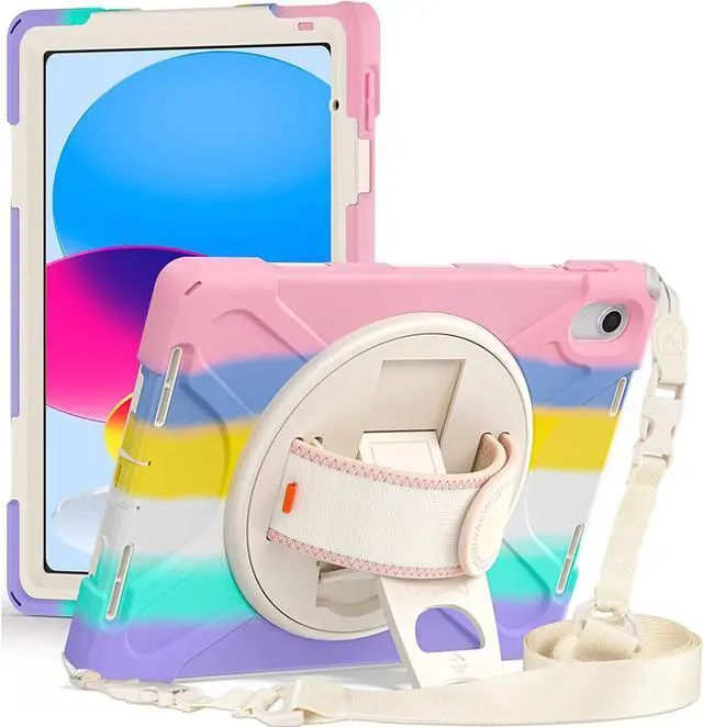 FEATURES: Built-in Kickstand is 360 degree rotating, you can adjust your 10th generation iPad to whatever angle you want, perfect for watching videos and chatting; Built-in elastic Pencil Holder makes it easy to pull out and store your Apple pencil Adjustable velcor hand strap allows big hand and small hand, perfect for kids and adults. Adjustable and detachable Shoulder belt is very convenience, safe and fashion you can carry tablet with should belt wherever you want