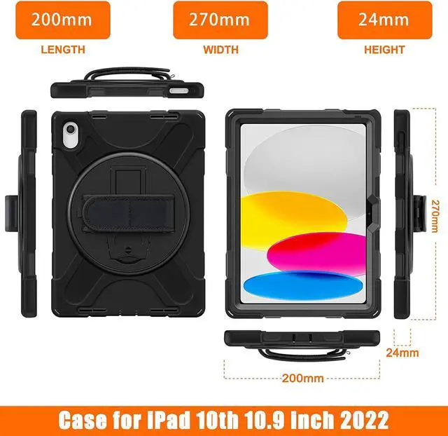 FEATURES: Built-in Kickstand is 360 degree rotating, you can adjust your 10th generation iPad to whatever angle you want, perfect for watching videos and chatting; Built-in elastic Pencil Holder makes it easy to pull out and store your Apple pencil Adjustable velcor hand strap allows big hand and small hand, perfect for kids and adults. Adjustable and detachable Shoulder belt is very convenience, safe and fashion you can carry tablet with should belt wherever you want