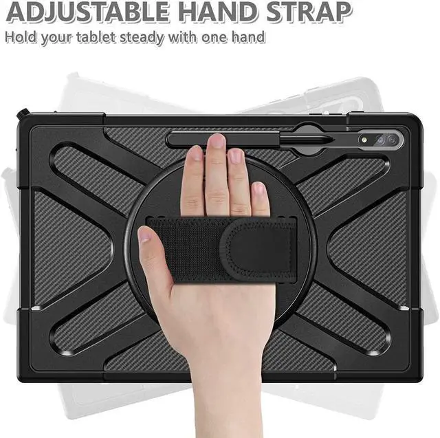 Protective Case with Kickstand and Hand Strap: Connected with 360° turntable built-in kickstand, you can adjust your galaxy tab S8 Ultra perfectly for watching videos and chatting. Adjustable hand strap allows big hand and small hand, perfect for kids and adults
