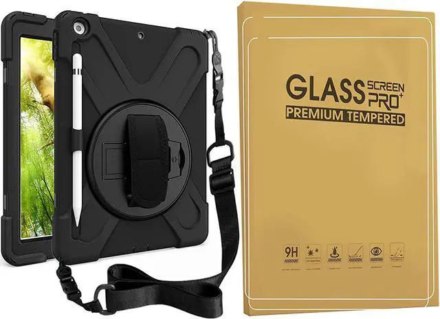 Bundle-iPad 8th/7th Generation 10.2 Case with Tempered Glass Screen Protector Pencil Holder Kickstand Hand Strap and Shoulder Strap, Black