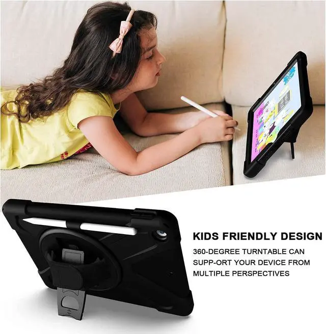 Rugged Case: Built-in Kickstand is 360 degree rotating, you can adjust your New iPad to whatever angle you want, perfect for watching videos and chatting; Built-in Pencil Holder makes it easy to pull out and store your Apple pencil store your Apple Pencil Adjustable velcor hand strap allows big hand and small hand, perfect for kids and adults. Adjustable and detachable Shoulder belt is very convenience, safe and fashion you can carry tablet with should belt wherever you want