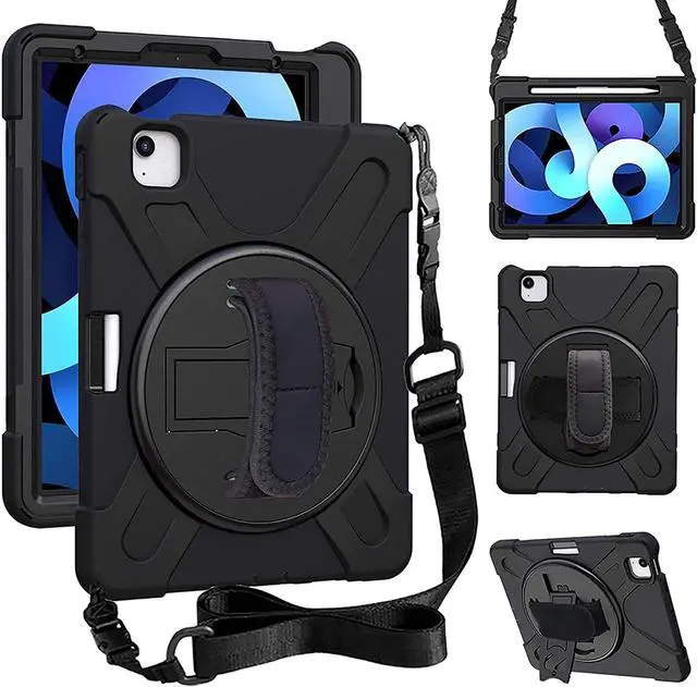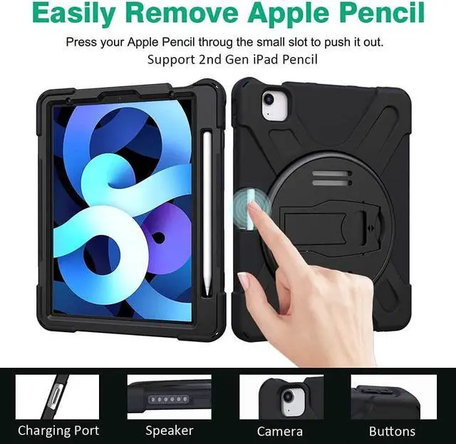 Rugged Case: Built-in Kickstand is 360 degree rotating, you can adjust your New iPad to whatever angle you want, perfect for watching videos and chatting; Built-in Pencil Holder makes it easy to pull out and store your Apple pencil store your Apple Pencil Adjustable velcor hand strap allows big hand and small hand, perfect for kids and adults. Adjustable and detachable Shoulder belt is very convenience, safe and fashion you can carry tablet with should belt wherever you want
