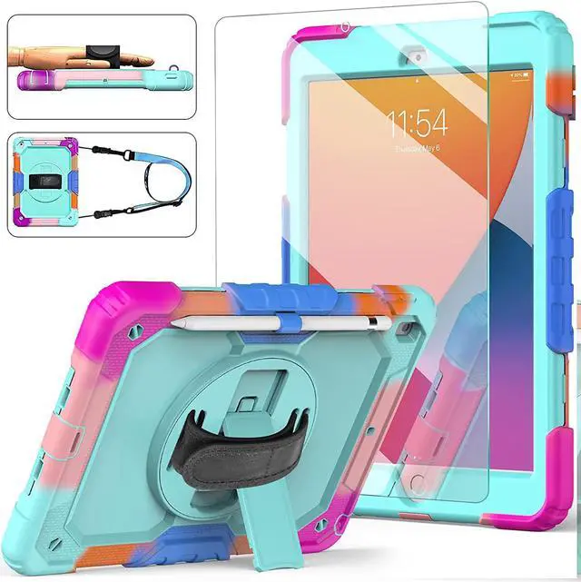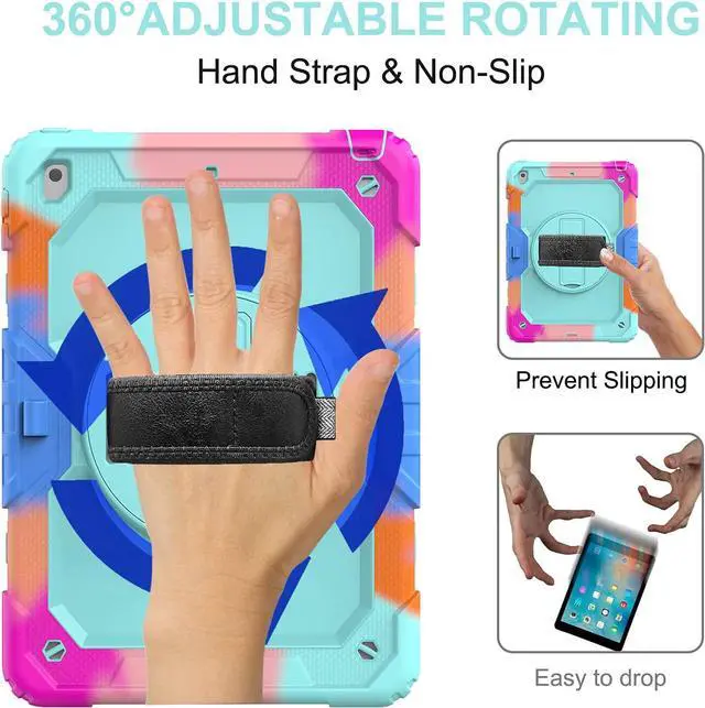 Shoulder Strap & 360° Rotatable Hand Strap/Kickstand: The adjustable hand strap helps you hold your iPad 9th/8th/7th gen easily, it is just as a grip with soft and comfortable feelings. You can get landscape view or vertical view as you want. And you could carry your iPad 10.2'' anywhere convenience with the shoulder strap. The length of the shoulder strap can be adjusted to fit adults or kids. With the rotating kickstand, you could get the watching angle and typing angle as you want.