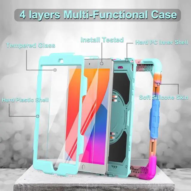 4 Layer Durable Protection: Flexible outer silicone & hard PC inner shell & tempered glass & top PC frame provide the max protection for your iPad 9th/8th/7th generation 2021/2020/2019. The outer silicone is quite thick and soft, it can absorb the impact from accident drop or shock. Totally kid/toddler proof product for your iPad 10.2 inch.