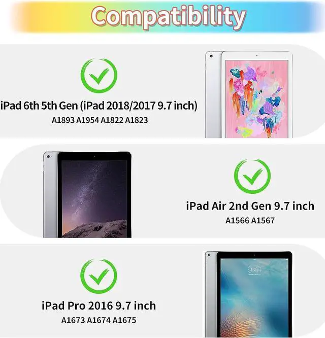 Compatible ModelDesigned for iPad 6th generation 2018Model: A1893 A1954), iPad 5th generation 2017 (Model: A1822 1823), iPad Air 2nd generation 2014 (Model: A1566, A1567) and iPad Pro 2016 (Model: A1673 A1674 A1675) 9.7 inch. Please confirm your iPad model before you order this case.This product includes 1x tablet case, 1x shoulder strap, 1x screen protector and 1x keychain.
