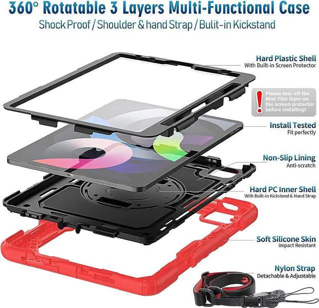 [All-Around Protection] 3 layers protection combined with "Front frame with built-in screen protector\u201d + \u201chard PC back cover\u201d + \u201csoft silicone outer shell". This rugged case offers commprehensive protection to your ipad when your ipad is dropped and Scratched.