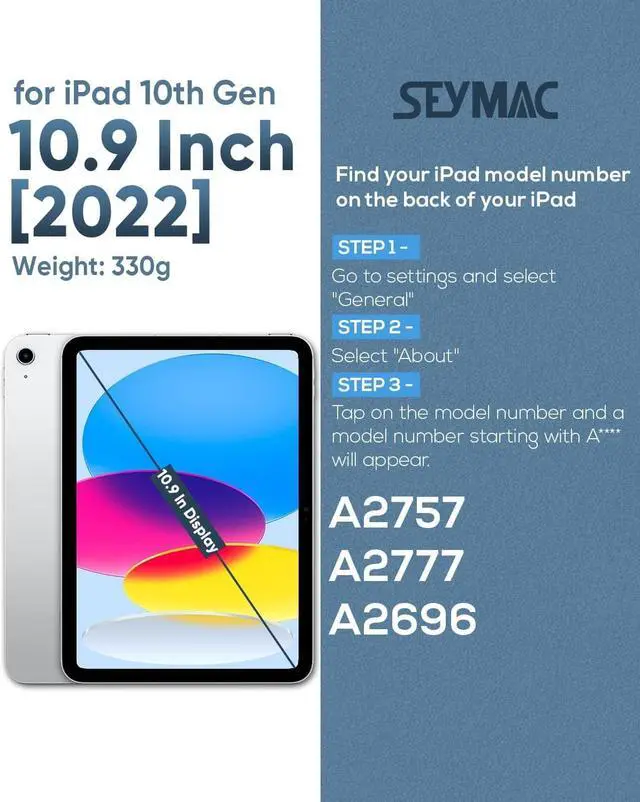 COMPATIBILITY- ONLY Fits for 10.9 Inch iPad 10th Generation 2022 (Model: A2696, A2757, A2777). It will not fit other iPad model. Please double check the model number on the back of iPad (A****) before purchase.
