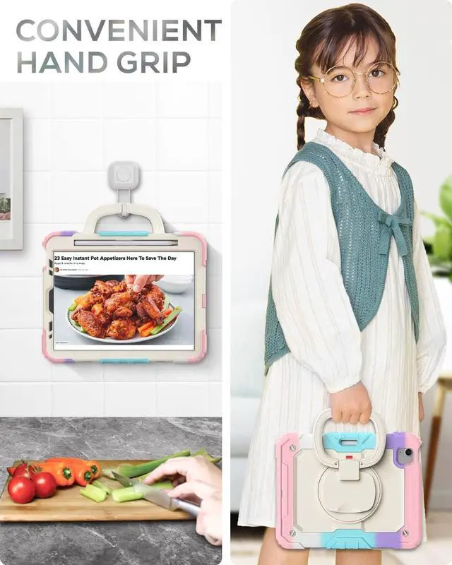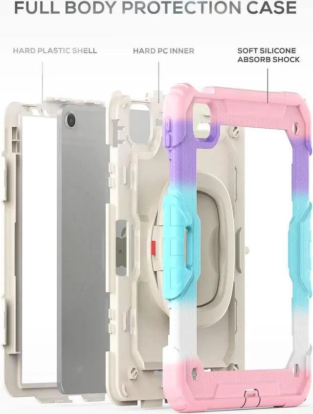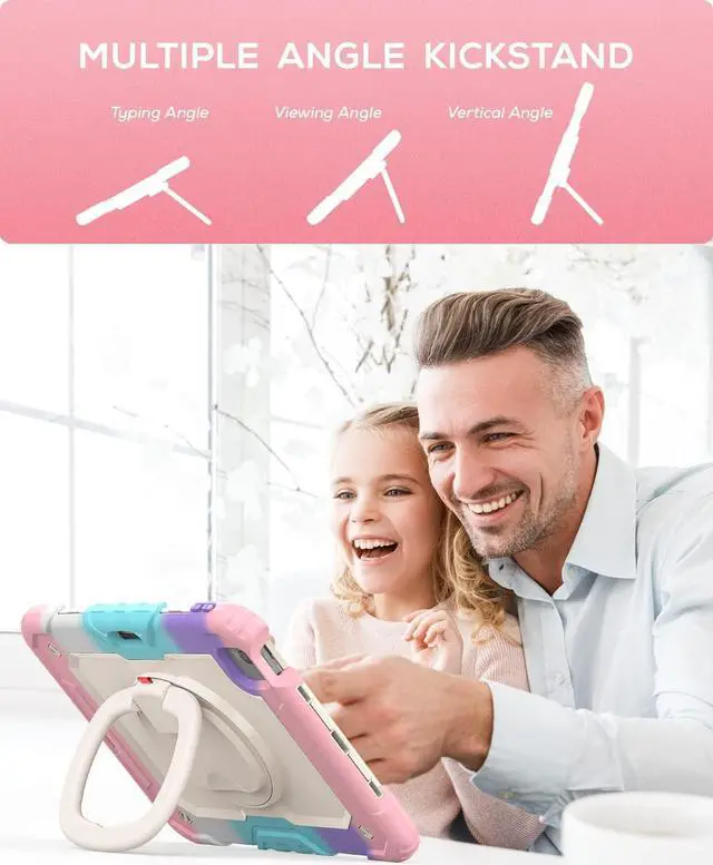 [Convenient Handle & Adjustable Shoulder Strap] The case is designed with 360°rotating and folding handle. The handle can be use as kickstand, offering multiple viewing and typing angles. Brings more convenience to your life. The shoulder strap can free our hands.Not only that, it can be hung in any places. For example, hanging on the back seat of a car to creates a mini theater for kids.