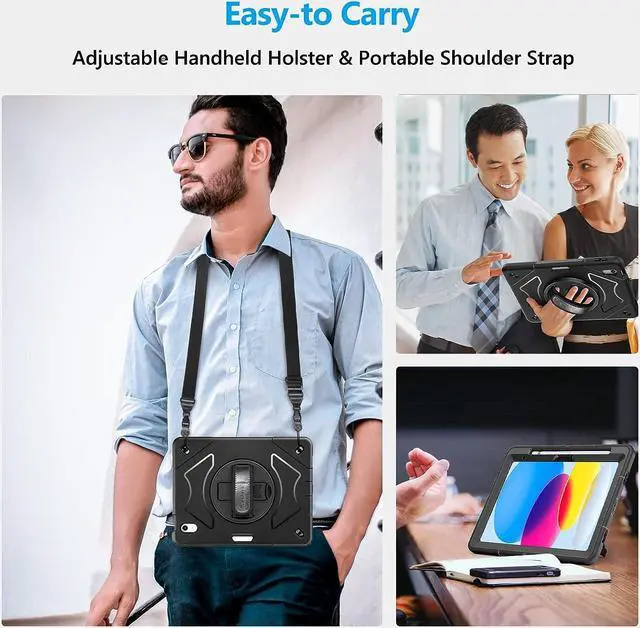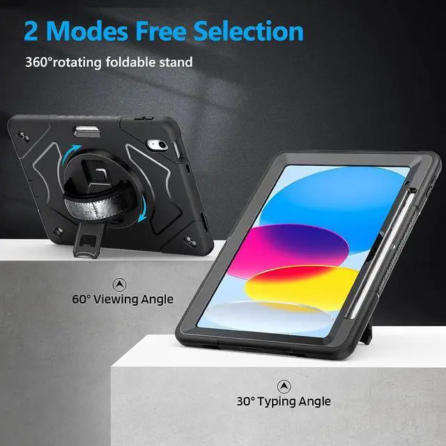 STABLE ROTATABLE KICKSTAND & ADJUSTABLE HANDHELD: Case Compatible with iPad 10 360° rotating foldable stand provides multiple angles(30°/45°/60°), nice to view, typing, or draw. Ergonomically adjustable hand strap easier to hold, the matte coating prevents slipping out of your hand.