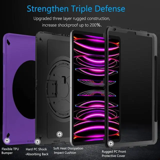 ENHANCED FULL-BODY PROTECTION &10-SHOCK: iPad 12.9 Pro Case exceed 2X Military Grade Drop Test Standard [MIL-STD 810G-516.6], Triple full-body heavy-duty protection provides up to 15ft drop protection, made of 2 durable PC and 1 flexible TPU bumper lasts 10× shock-resistant. Upgrade built-in sponge technology adds extra heat-dissipation.