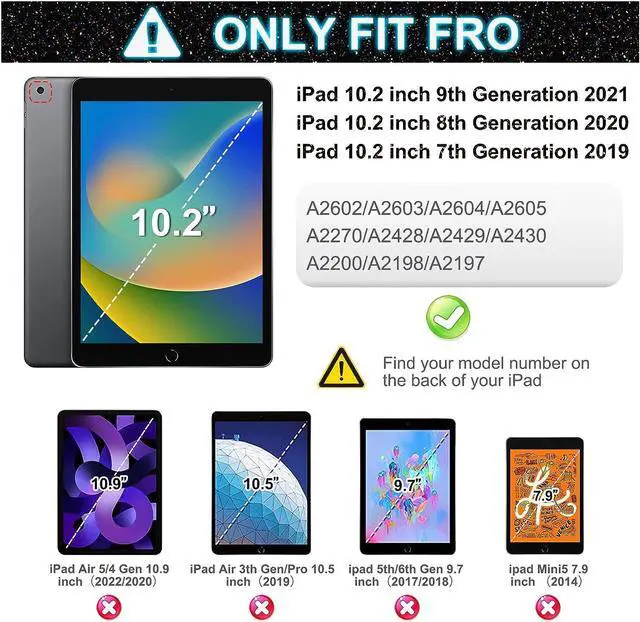 • Compatibility Only fit for Apple iPad 9th Generation 10.2 Inch 2021, Apple iPad 8th generation 10.2 inch 2020 [MODEL :A2270/A2428/A2429/A2430] and Apple iPad 7th Generation 10.2 Inch 2019 [MODEL :A2197/A2198/A2199/A2200], WILL NOT FIT ANY OTHER MODEL. Pencil Cap Holder is included, but Apple Pencil and Pencil Cap is not included.