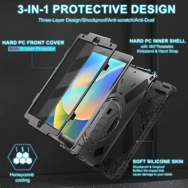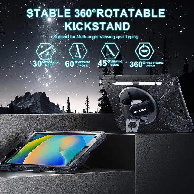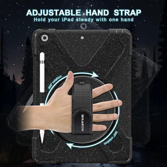 360° Swiveling Stand & Hand Strap Located on the back of iPad 9th/8th generation 10.2 Inch shockproof case 2021/2020, built-in 360 degree rotating kickstand and adjustable handle hand strap provides a more flexible and convenient way to use your tablet during work, study or journey, ideal for students,teachers,engineers,cashiers and waiters,etc.