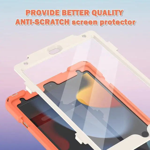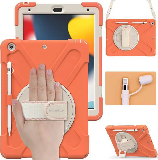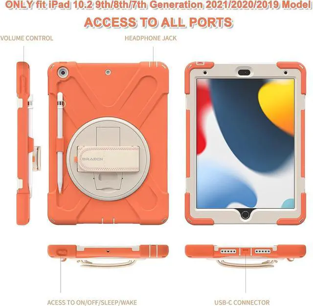 Kids Case for iPad 9th/8th/7th Generation 10.2\u201d2021/2020/2019, Heavy Duty Shockproof Case with Screen Protector,Pencil Holder,Pencil Cap Holder,Hand Strap,Kickstand,Shoulder Strap-Coral Orange