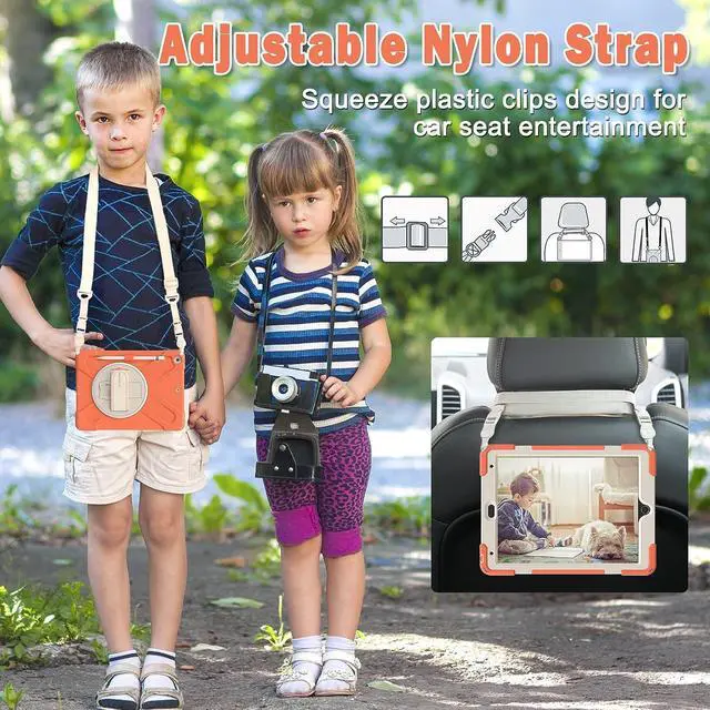 Adjustable & Detachable Carrying Strap Portable Shoulder Strap allows to carry your iPad in landscape/portrait mode securely in outdoors or hang your iPad in kitchen,bedroom,car seat for convenient usage.