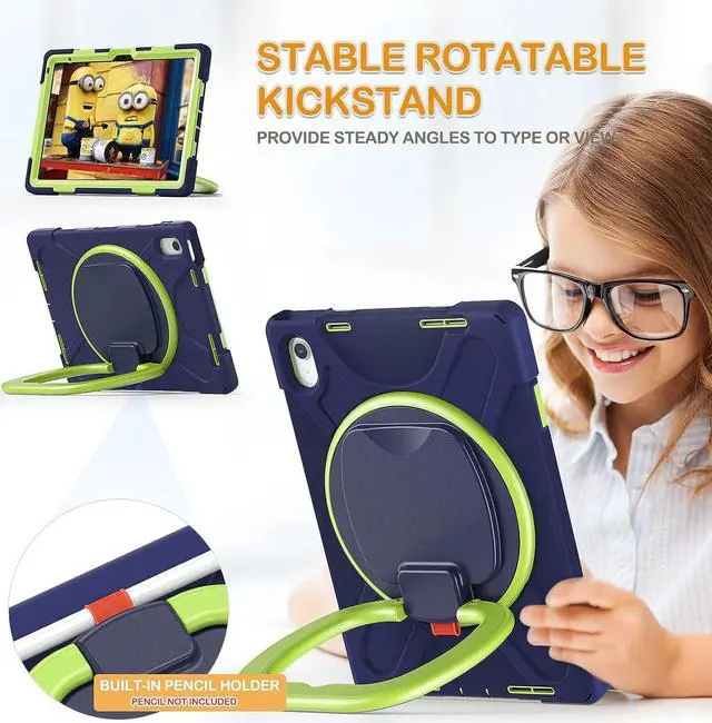 FUNCTIONALITY: 360°rotating +180°folding grip, can be used as a handle, easy to hang your iPad in kitchen, washroom, bedroom; Kickstand is stable enough to stand on different surfaces for children to view. Button and port cover enable to prevent dust.