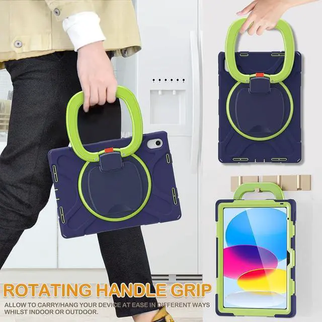 iPad 10th Generation Case 2022-Rugged Silicone Cover for iPad 10.9 Inch 10th A2696 A2757 A2777-Swivel Ring Stand/Pencil Holder/Handle Grip/Kickstand/Screen Protector/Shoulder Strap, Navy Green