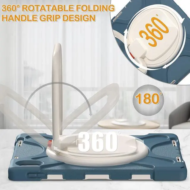 FUNCTIONALITY: 360°rotating +180°folding grip, can be used as a handle, easy to hang your iPad in kitchen, washroom, bedroom; Kickstand is stable enough to stand on different surfaces for children to view. Button and port cover enable to prevent dust.