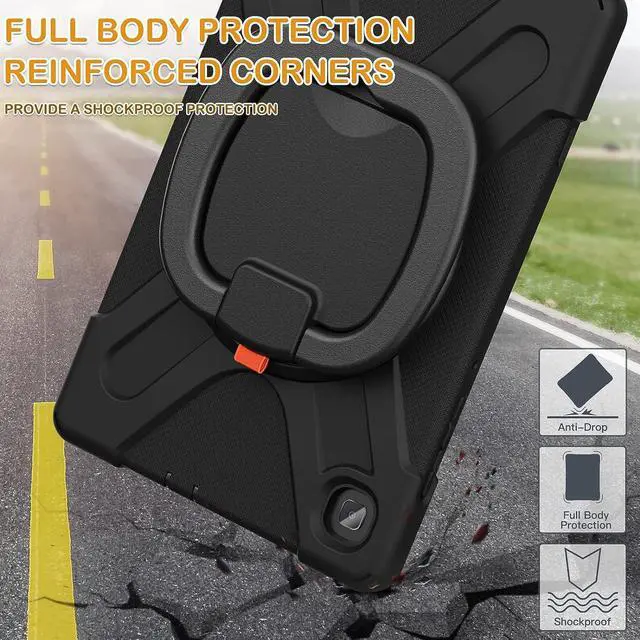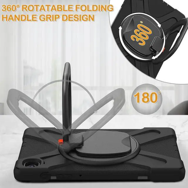 [Multi-Function Features] 360°rotating +180°folding Grip can be used as a handle, easy to hang your Tablet in kitchen, washroom, bedroom; Kickstand is stable enough to stand on different surfaces for children to view. And with a adjustable shoulder strap, it is convenient for you to carry and hang everywhere.