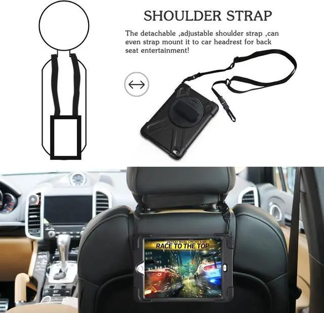[Adjustable/Removable Shoulder Strap] Attach straps to any two holes to carry your device vertically or horizontally like a messenger bag/neck bag/sling/harness or holster; Allow you to display your iPad Mini5 & 4 behind one seat for personal viewing or between two seats for shared viewing.