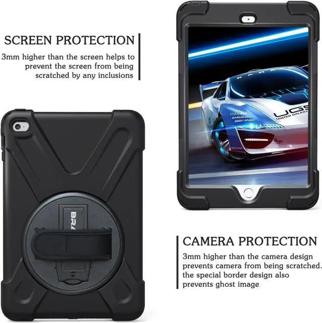 [360 Degrees Rotatable Kickstand & Adjustable Hand Strap] Built-in stand offers optimum position for typing or viewing; Ergonomic and comfortable back handle allows you to grip your 4th/5th Gen iPad Mini securely and steadily with one hand, worry-free from dropping it. Ideal for kids, students, teachers or anyone else who needs it for presentations, conferences and travelling.