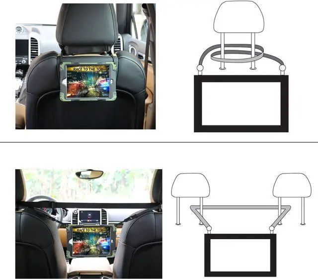 [Adjustable/Removable Shoulder Strap] Attach straps to any two holes to carry your device vertically or horizontally like a messenger bag/neck bag/sling/harness or holster; Allow you to display your iPad Mini5 & 4 behind one seat for personal viewing or between two seats for shared viewing.