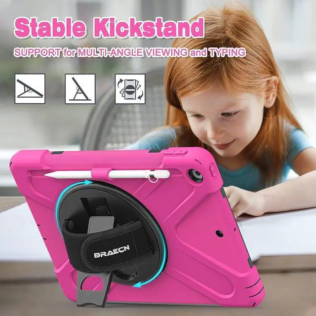 360° Swiveling Stand & Hand Strap Located on the back of iPad 9th/8th generation 10.2 Inch shockproof case 2021/2020, built-in 360 degree rotating kickstand and adjustable handle hand strap provides a more flexible and convenient way to use your tablet during work, study or journey, ideal for students,teachers,engineers,cashiers and waiters,etc.