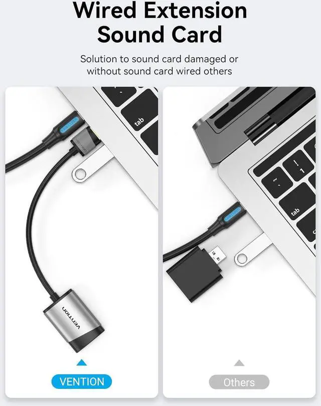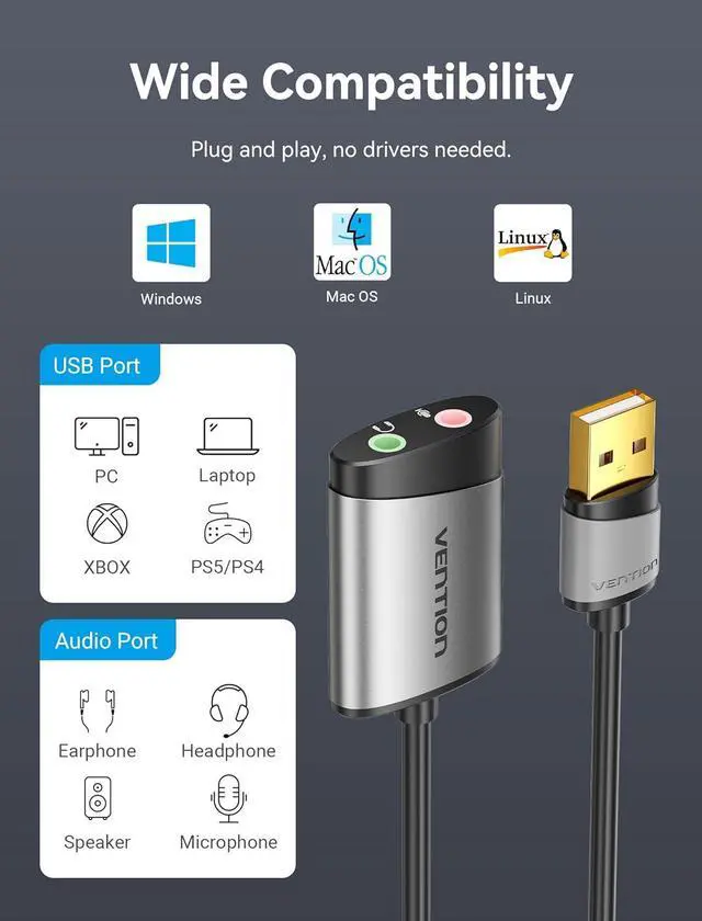 Ideal Sound Card Choice: The VENTION USB audio adapter is the ideal replacement for your faulty sound card or audio port. It expands the 3.5mm mono microphone input and speaker-headphone output through the USB interface, allowing you to connect small speakers, earphones, microphones, dual-plug earphones, and more.