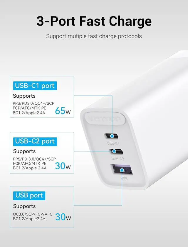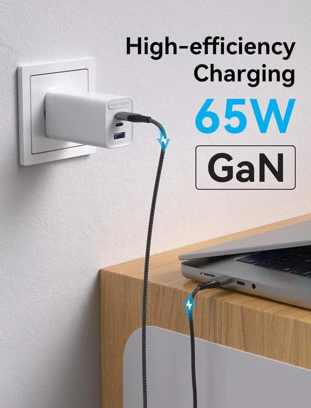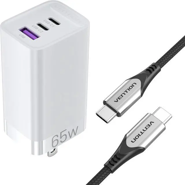 One Charger for 3 Devices - The VENTION 3 Port 65-watt USB-C charger provides enormous charging power and fast charge your phone, tablet, and laptop at the same time. This 65W USBC laptop charger is a must-have gadget in your backpack.