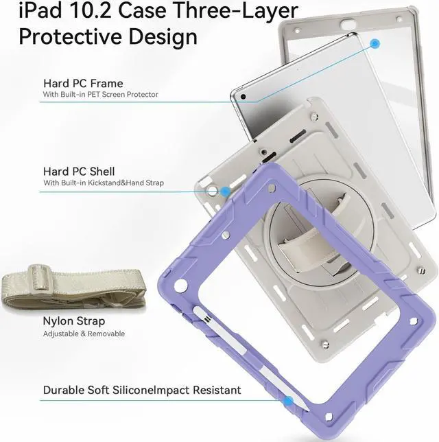 Detachable & Adjustable Shoulder StrapAttach the strap to any two corner holes of this iPad 10.2 Case.Carry your iPad conveniently wherever you are at home, at work,or on a trip.You can also hang it behind the headrest of the car seat for shared viewing.