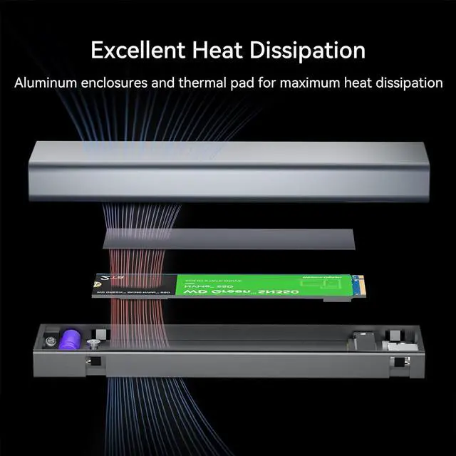 Support Dual Heat Dissipation: In addition to supporting NVME, the DOCKCASE RTL9210 control chip is equipped with temperature control and can be up to 10 degrees lower than other chips, reducing heat generation from the source. The first cover with the graphite thermal pad increases the heat dissipation area and blows away the heat timely enabling your SSD to maintain high transfer speeds and extending its longevity.