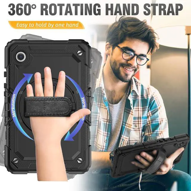 360 Rotating Hand Strap & StandWith adjustable swivel hand strap and stand, you can hold the tab A9 8.7\u2019\u2019 by one hand and find the most comfortable viewing angle you need. The built-in stand provides a stable supports, with viewing/drawing/typing angles you need, and it can be folded up when not in use.