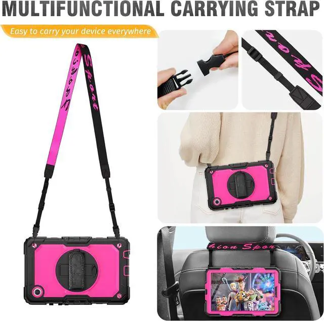 Multifunctional Carrying StrapThe shoulder strap of this A9 tablet Case is detachable and adjustable, both kids and adults can use it to carry the tablet around during hiking, traveling or other activities outside. Also, you can also hang the tablet on the back of seat for fun when traveling in cars.
