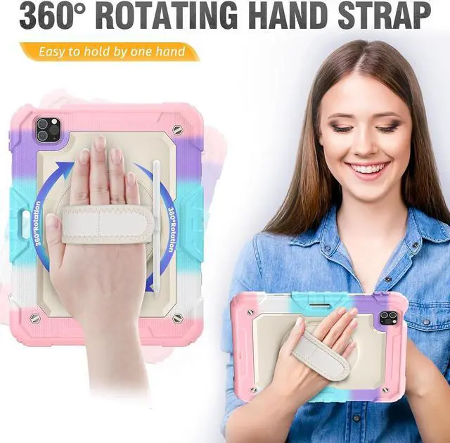 for iPad Pro 11 inch Case (2022/2021/2020/2018) with Screen Protector / 360 Rotating Hand Strap Stand/Pencil Holder, [3-Layer] Protective iPad 11 Case Pro 4th/3rd/2nd/1st, Pink