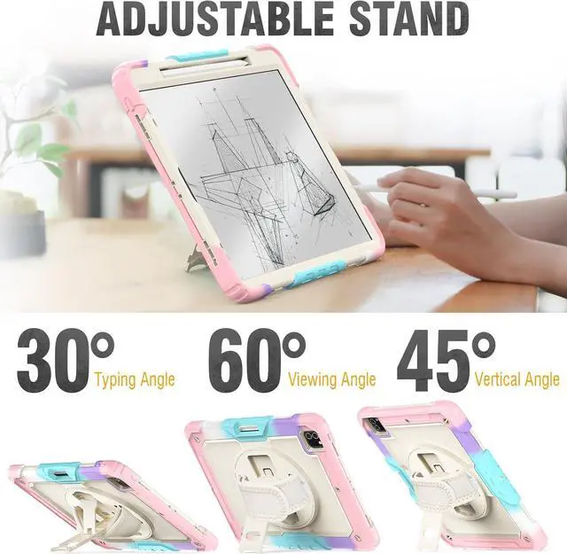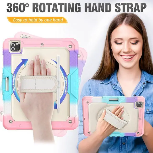 Rotating Hand Strap & Stand \u2014 This pro12.9 case 2022 provides a stable supports, with viewing/drawing/typing angles. You can hold the Pad safely by one hand and find the most comfortable viewing angle you need. also, the stand can be folded up when not in use.