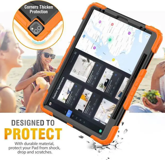 Shockproof+Screen Protector \u2014 This case for iPad 12.9 inch is designed with durable anti shock material, soft silicone, hard plastic shell and built-in screen protector(2 front covers, one with built-in screen protector and one without). This sturdy 12.9 pro case can keep your pad safe from shock, drop, scratch or accidental damages in daily use.