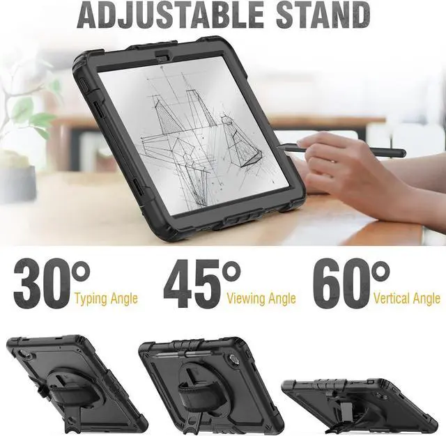 360 Rotating Hand Strap & StandThis shockproof M11 tablet case can support in different viewing/drawing /typing angles, you can hold the tablet safely by one hand, ideal for meeting, working. Also, the stand can be folded up when not in use.