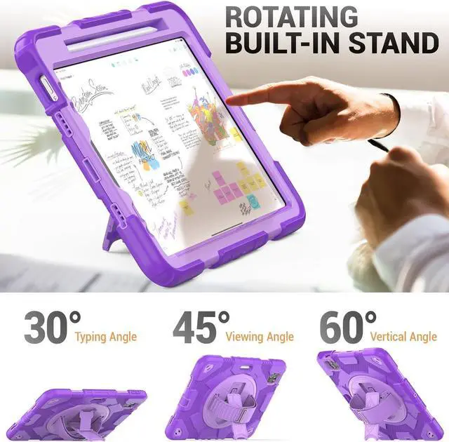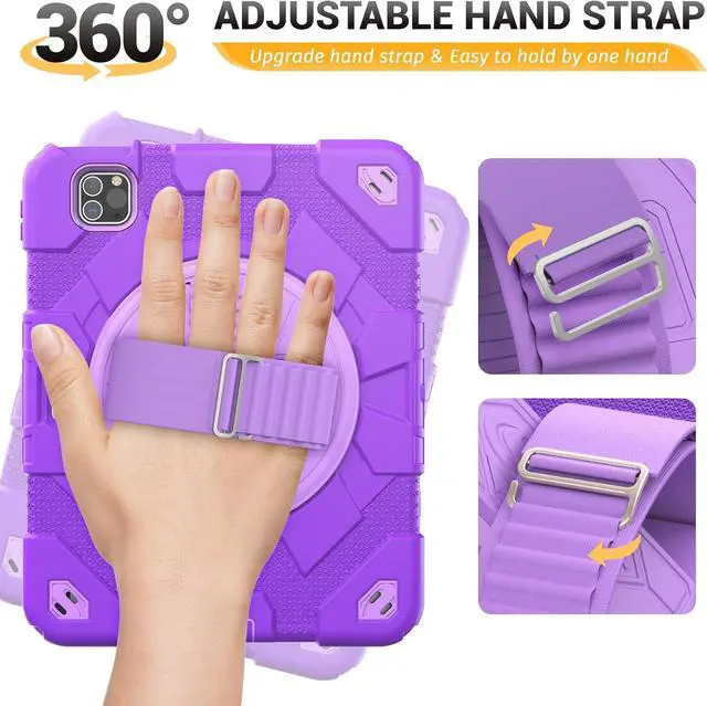 Screen Protector & Rotating Hand Strap Stand A. The upgraded strap has more adjustable positions, both kids and adults can use it, also easy to hold the Pad by one hand and find the most comfortable viewing angle you need. B. The rotating stand provides a stable support, you can change it to viewing/drawing/typing angles you need, and it can be folded up when not in use.