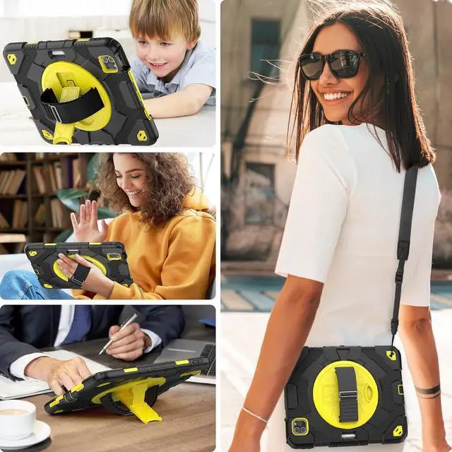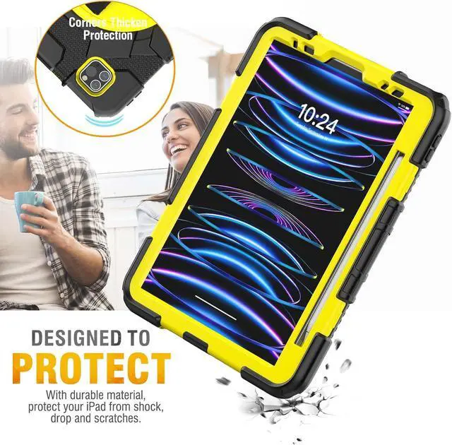 Case for iPad Pro 11 inch 2022/2021/2020/2018, with Pencil Holder, Screen Protector, Rotating Hand Strap Stand, [3-Layer Drop Proof] Case for Pro 11 4th/3th/2nd/1st (Yellow)