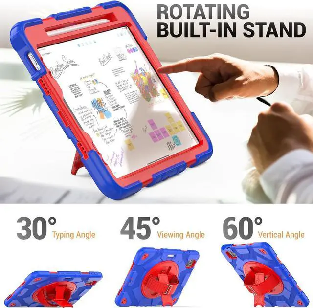 Screen Protector & Rotating Hand Strap Stand \u2014 A. The upgraded strap has more adjustable positions, both kids and adults can use it, also easy to hold the Pad by one hand and find the most comfortable viewing angle you need. B. The rotating stand provides a stable support, you can change it to viewing/drawing/typing angles you need, and it can be folded up when not in use.