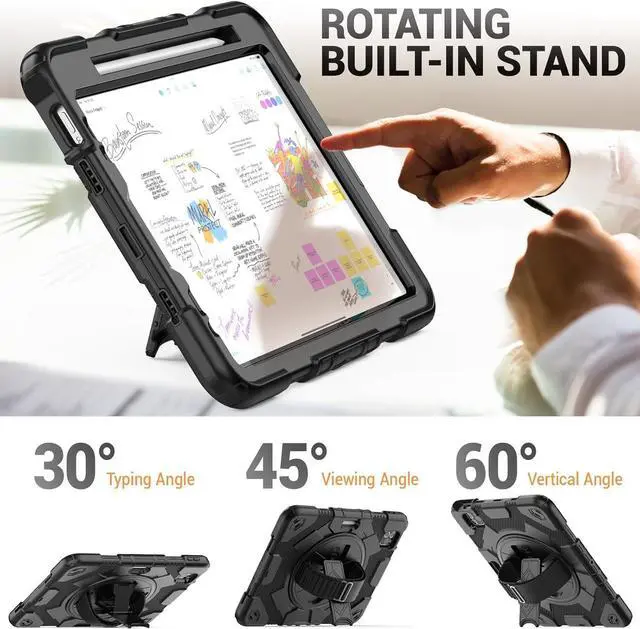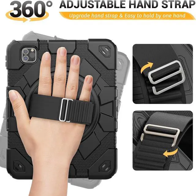 Screen Protector & Rotating Hand Strap Stand \u2014 A. The upgraded strap has more adjustable positions, both kids and adults can use it, also easy to hold the Pad by one hand and find the most comfortable viewing angle you need. B. The rotating stand provides a stable support, you can change it to viewing/drawing/typing angles you need, and it can be folded up when not in use.