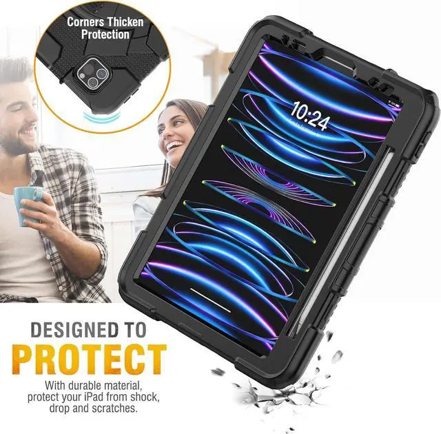 Drop Proof Design & Protector \u2014 This Pro 11inch Case is Designed to Protect ! With sturdy anti shock material, soft silicone, hard plastic frame and built-in screen protector (package contains 2 front covers, one with screen protector and one without). Full body sturdy Pro 11 inch case can keep your Pad safe from shock, drop, scratch or accidental damages in daily use.