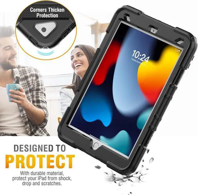 Drop Proof Design & Protector \u2014 This case for iPad 10.2 inch & 10.5 inch is Designed to Protect ! With sturdy anti shock material, soft silicone, hard plastic frame and built-in screen protector (package contains 2 front covers, one with screen protector and one without). Full body sturdy case can keep your Pad safe from shock, drop, scratch or accidental damages in daily use.