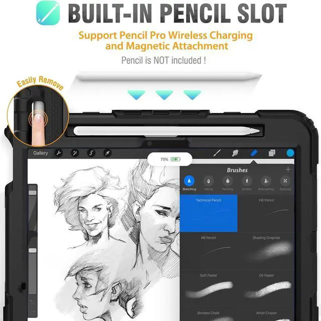 Pencil Holder & Precise Cut-outsAllow easy access to all ports and buttons, the Pencil Slot Holder supports pencil 2nd wireless charge and magnetic attachment, always keep your pencil secure in place, free take the Air 11 / Air 6th Gen case around or put it in to a bag.