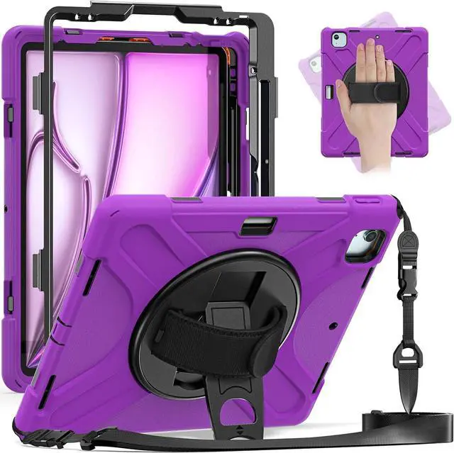 Case for iPad Air 13 inch (2024) M2 Chip Model A2898/A2899 Heavy Duty Rugged Durability Silicone Tablet Cover with 360° Rotating Hand Strap Foldable Hidden Stand & Shoulder Strap, Purple